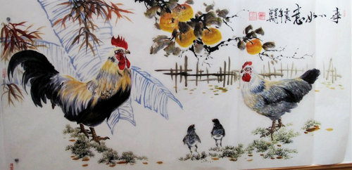 沒有量的積累就沒有質的爆發。孫洪興就是這樣通過不斷地從大自然和其他民族藝術及流派中汲取營養,而不斷發展,不斷創新,不斷完善自己,不斷超越自己。應該說,最能體現這種創新和超越的,就是孫洪興筆下的雞。畫雞的畫家很多,如古代的梅行思、母咸之,當代的凌立如、楊建臣等,然而孫洪興畫的雞卻與眾不同。他畫雞的工具是毛筆、油彩和宣紙——毛筆蘸油彩,在宣紙上作畫,這是孫洪興的大膽嘗試。西方油畫的顏料與中國傳統畫的毛筆和宣紙的組合,為他的創作開辟了一方嶄新的天地,當走入這片天地后,孫洪興發現原來這里更加天高地闊、景色無限,可任由自己盡情翱翔。