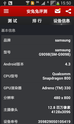 通過安兔兔硬件信息可以看到領(lǐng)世旗艦G9098使用高通驍龍800四核CPU,核心頻率為2.26Ghz,擁有非常出色的性能,領(lǐng)世旗艦G9098擁有2GB的內(nèi)存和32GB的儲存空間。