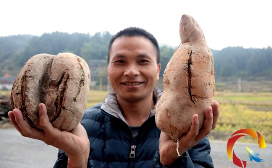 本網訊 12月19日,錦屏縣高寨村村民李月喜在展示自家的大紅薯。“今年我家在萬門巖(地名)栽種0.8畝地的紅薯,全部施用天然農家肥,個頭都很大,最大的一個有4、3公斤,平均畝產3000多公斤。”李月喜高興的告訴筆者。據當地一位農技人員介紹,可以在全縣推廣栽種。(李斌)