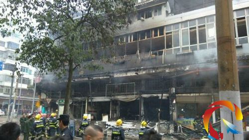 記者在現場看見事發地為一棟商住兩用樓,一樓為店鋪門面,二樓據稱為某網吧,一樓和二樓均遭受火災。現場一片狼藉,散碎的玻璃灑滿一地,墻面都已被熏黑。消防隊員調來數臺消防車,正全力滅火。