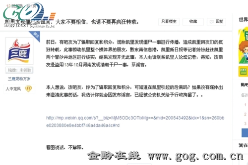 此外,記者在網絡上還找到了辟謠的網帖。網友“三鹿奶粉萬歲”說,前日,有人為了騙取回復和積分,謊稱凱里發現僵尸,造成凱里網友瘋狂轉載…… 本人電話聯系凱里人論壇記者,得知,該網友是盜用2013年10月河南發現清朝干尸一事,系謠言。同時,“三鹿奶粉萬歲”還曬出了題為“凱里挖出僵尸這謠言的來龍去脈”的微信。(羅茜)