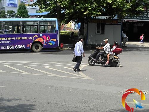 橫穿馬路的行人也各式各樣,有拖著行李箱的,有扶著老人的,還有父親帶著小孩子的。看著這些行人在車來車往的道路上穿行,真讓記者為其捏了一把冷汗。