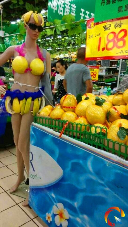 昨日上午,記者在凱里佳惠超市蔬果區看到,一個塑料模特立在柚子柜旁,整個柚子皮在中間劈前,儼然一件完美的女士胸罩,剪成條狀的柚子皮充當模特的頭飾和內褲,腰間系著一條深藍色的腰帶并戴著一個黑色墨鏡,真是性感至極!
