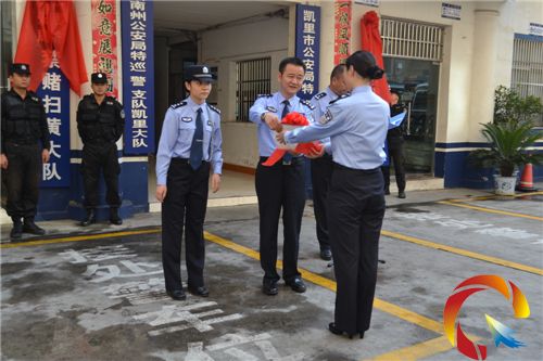 凱里市公安局黨委副書(shū)記、常務(wù)副局長(zhǎng)歐洪同志介紹禁賭掃黃大隊(duì)、特巡警大隊(duì)警衛(wèi)中隊(duì)、法制大隊(duì)案審中隊(duì)組建情況及成立的目的、意義及作用,黔東南州公安局黨委委員、副局長(zhǎng)、市委常委、市委政法委書(shū)記、市公安局黨委書(shū)記、局長(zhǎng)巫貴生同志授牌。