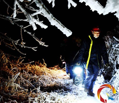 2月11日,雖然天空逐漸放晴,氣溫有所回升,但高山地區(qū)氣溫一直徘徊在零下4至6攝氏度,冰凍并未融化且有加重趨勢(shì)。當(dāng)天下午17時(shí),記者跟隨該局孟彥供電所到位于大稼鄉(xiāng)竹山村龍型敖地段的覆冰重災(zāi)區(qū)電力線路開(kāi)展夜間特巡。