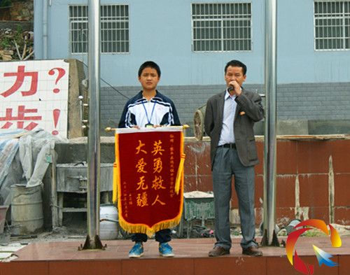 本網(wǎng)訊 5月26日,黎平縣德鳳中學正在舉行升國旗儀式,突然有幾位家長“闖”進了學校,將一面錦旗交給了校長,請校長轉(zhuǎn)交給該中學初二年紀的方釗同學。因為之前,方釗及時出手“連環(huán)”施救,救出了他們的孩子。
