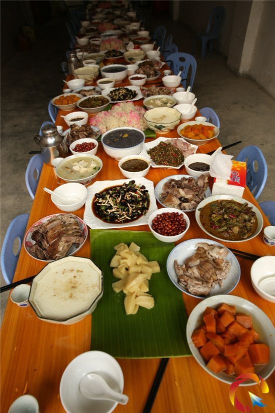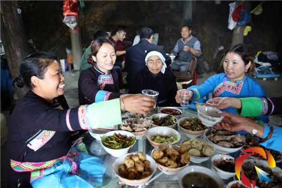 2014年春節,茨洞村總計有18位女子出嫁,18位娶親的男子共出動了1800人迎親,在迎親過程中,大伙統一挑著禮物一一送往出嫁的女子家,場面非常壯觀。圖為茨洞村一戶有成年女子的人家做豐盛菜肴招待媒人的情形。(陸書明 楊露 攝影報道)