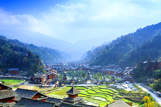據悉,肇興侗寨是全世界最大而又最古老的侗寨。分上、下兩寨,全寨有700余戶,3000余人。寨里有5座氣勢雄偉、建筑獨特的鼓樓,這在侗族地區是罕見的。全寨被參天古樹和茂林修竹所圍繞,寨內流水瀠回,吊腳樓房屋、曬禾架、魚塘和風雨橋四陳,井然有條。