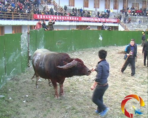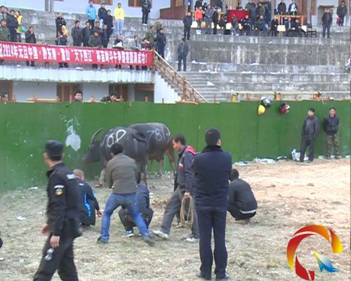 1月1日,2014元旦中國•黔東南•雷山“天下西江杯”苗嶺斗牛爭霸賽在雷山縣文體中心隆重舉行,來自全國各地的30余頭牛王參加當天斗牛B組的比賽。