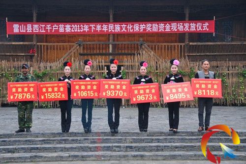 1月28日,雷山縣西江千戶苗寨舉行民族文化保護(hù)獎(jiǎng)勵(lì)資金發(fā)放儀式,1218戶村民喜領(lǐng)2013年下半年民族文化保護(hù)獎(jiǎng)金839萬元,加上上半年發(fā)放的401萬元,西江千戶苗寨的村民在2013年全年領(lǐng)到了民族文化保護(hù)獎(jiǎng)勵(lì)金1240萬元。