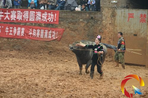 本網訊 3月30日,雷山著名"苗寨斗牛一枝花"李靈婷拉牛赴麻江縣碧波七鑫斗牛城,參加麻江首屆“郵政電信杯”百牛爭霸賽,她拉的牛為A組120號麻江博愛猛牛,在百牛角逐“牛王”爭霸中,榮獲A組第一名,奪得30800元大獎。