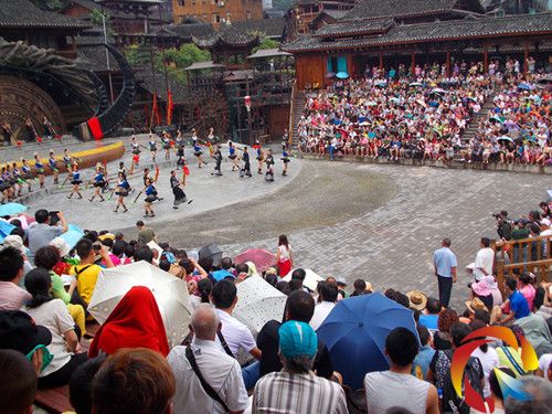 近年來,雷山縣委、縣政府對(duì)該寨加大旅游投資力度,加強(qiáng)基礎(chǔ)設(shè)施建設(shè),大力發(fā)展旅游產(chǎn)業(yè),以發(fā)展新農(nóng)村旅游,生態(tài)農(nóng)業(yè)觀光旅游,自然田園風(fēng)光旅游為重點(diǎn),建成集生態(tài)觀光、娛樂、旅游、休閑、度假為一體的鄉(xiāng)村旅游景區(qū)。“進(jìn)農(nóng)家屋,吃苗家飯,喝苗家酒,品農(nóng)家茶,賞苗寨景”的田園式,體驗(yàn)型鄉(xiāng)村旅游度假活動(dòng)。圖為10月1日西江景區(qū)旅游表演場(chǎng)面。(張希才 王曉益 楊小林)