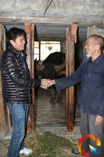 被斗牛屆稱為無敵手的“瀘西巨無霸”兩位新老牛主(左,錢老三;右,文志國)在牛王的老家及老圈前談笑風生