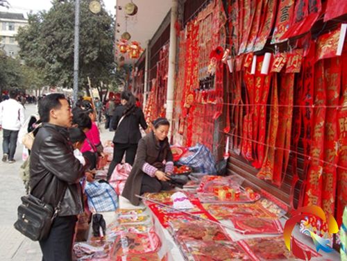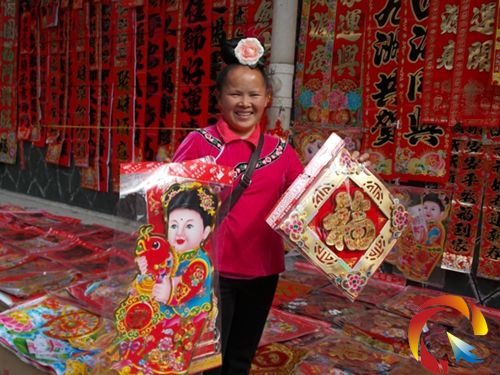 新春佳節到來之際,在雷山縣縣城隨處可見各族群眾購買年貨身影。有的買對聯,有點買糖果,準備過年。圖為1月15日縣城趕集日苗族農民購買春聯的場面。(作者: 張希才)