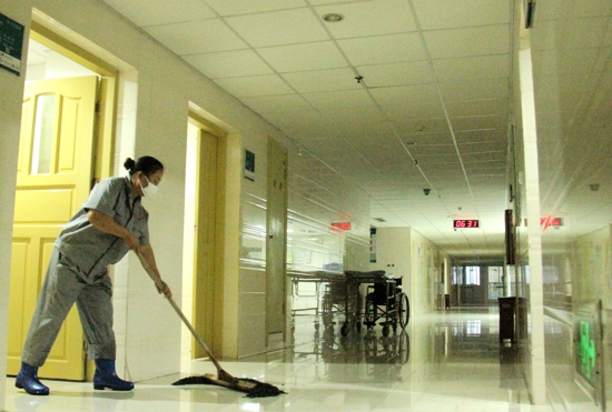 楊孟林打掃好樓層的過道、樓梯,便輕手輕腳地進(jìn)入病房收垃圾、擦門窗、洗衛(wèi)生間和拖地。