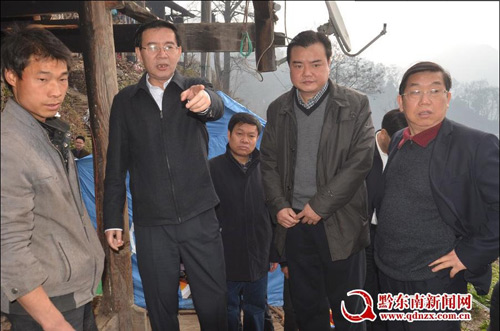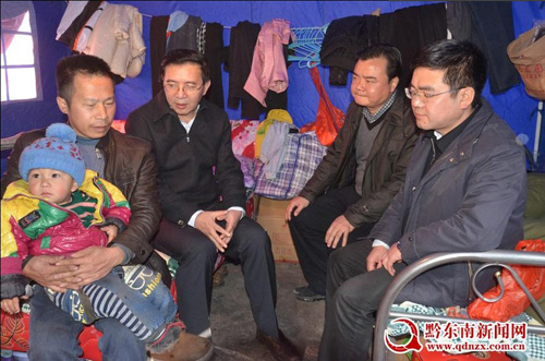 2014年1月30日,州四大班主要領導州委書記李飛躍、州長廖飛、州人大主任羅亮權、州政協主席梁承祥以及州委常委副州長馮仕文、州委秘書長耿生荗、州委組織部長王貴、州政協副主席鄧錦光一行,農歷臘月年三十慰問鎮遠縣報京受災群眾。李飛躍走進救災帳篷,與群眾促膝交淡,問寒問暖。(丁新成)