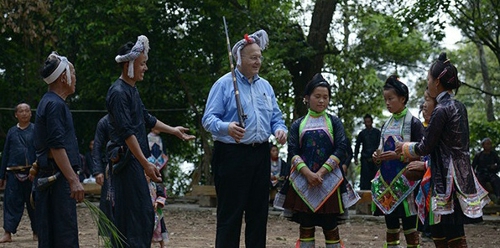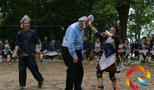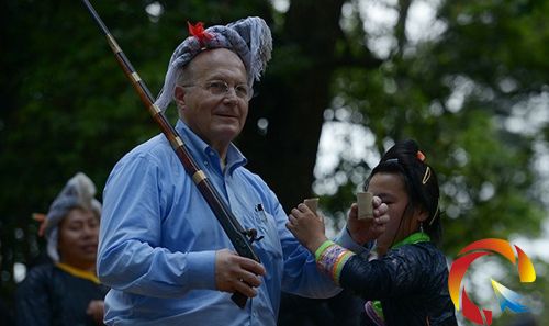 在眾多游客與岜沙村民的見證下,這名“洋女婿”與他的岜沙“新娘”一一完成了姑娘臨嫁、變身“槍手”、當眾求婚、飲交杯酒、送吉祥飯、接受祝福、回娘家等婚禮儀式,體驗了中國岜沙苗族的神秘“婚禮”。