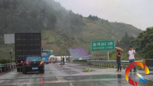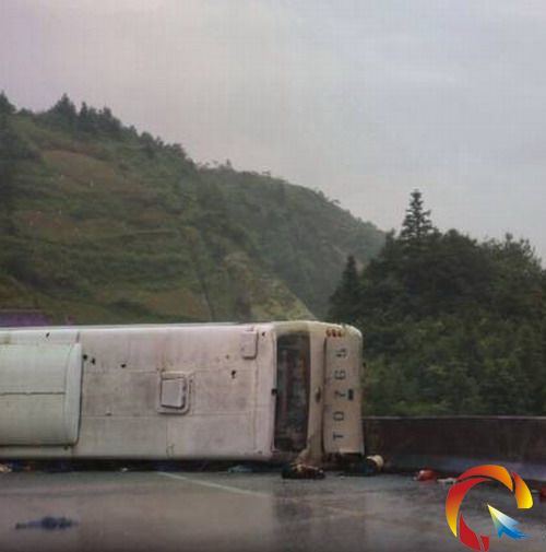 據(jù)了解,大客車從貴陽始發(fā),因下雨路面濕滑,在彎道失控側(cè)翻。