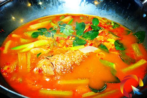 經過油炸后的魚清脆爽口,配上不過油的糟辣椒,再放上一小碟廣菜以及花椒葉等,加上適量的水煮沸,黔東南特有的酸湯脆皮稻香魚就出爐了。
