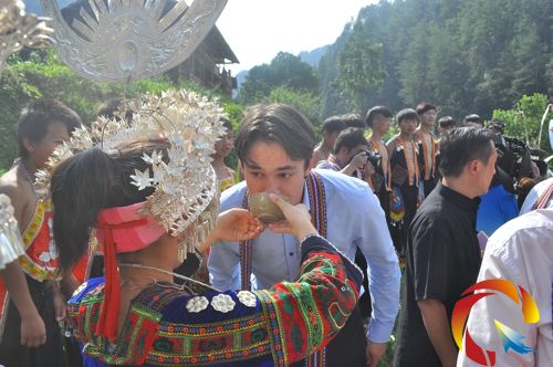 當日下午,伴隨著氣勢恢宏的迎賓蘆笙,中國作協副主席葉辛,國家發改委國際合作中心主任助理陳喆,瑞士議長代表團的代表等嘉賓和各個媒體的記者,一踏上進寨的石階,就飲上了當地自釀的醇香米酒,旅途疲憊立即一掃而光。
