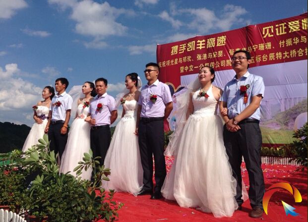為了凱羊高速公路快速建成通車,不少年輕人把全部的精力都投入到了緊張的建設(shè)之中,他們在高速公路建設(shè)中相知相戀。在臺辰特大橋勝利貫通之際,他們用集體婚禮的方式見證大橋貫通,并在這特殊的日子里,共同見證了4對新人心手相牽、共同走向人生的幸福殿堂。