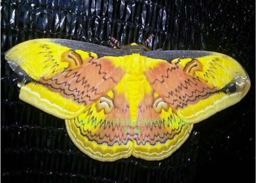 形態(tài)特征:紅大豹天蠶蛾Loepa oberthür Leech,翅展100-140mm。體黃色,胸部前緣灰褐色,腹部?jī)蓚?cè)有黑色斑點(diǎn);前翅前緣灰褐色,內(nèi)線及外線呈棕黑色波狀紋,亞端線藍(lán)色波狀,靠近前緣不明顯,越向后色越深,頂角橙黃色,向內(nèi)有白色波紋,白紋下方有黑色橫斑直達(dá)中脈,后緣前方有橙紅色區(qū)一塊;前翅及后翅中室端有橙黃色圓斑一塊,中間有弧形的并行黑白線各一條。