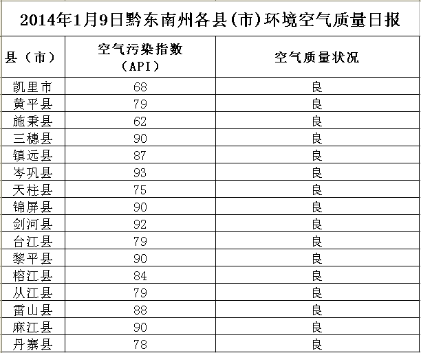2014年1月9日黔東南州各縣(市)環境空氣質量日報