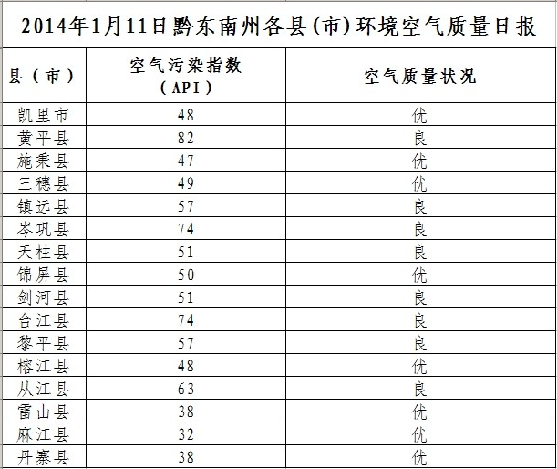 2014年1月11日黔東南州各縣(市)環(huán)境空氣質(zhì)量日?qǐng)?bào)