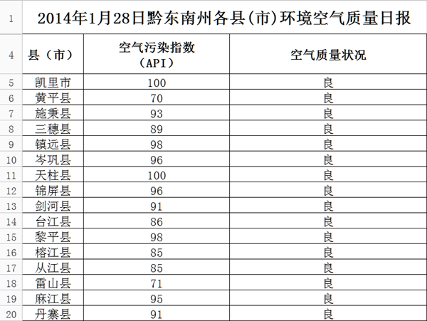 2014年1月28日黔東南州各縣(市)環境空氣質量日報