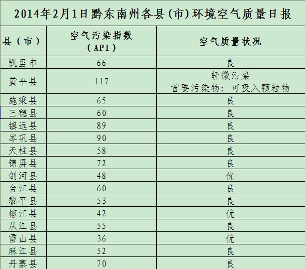 2014年2月1日黔東南州各縣(市)環(huán)境空氣質(zhì)量日?qǐng)?bào)