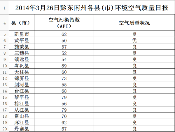2014年3月26日黔東南州各縣(市)環境空氣質量日報
