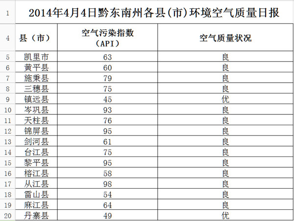 2014年4月4日黔東南州各縣(市)環境空氣質量日報