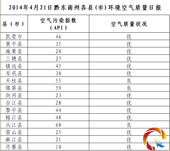 2014年4月21日黔東南州各縣(市)環境空氣質量日報