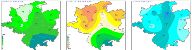 降水量:8月下旬全州降水量5.3mm(鎮遠)~76.8mm(從江) (圖2左),與歷年同期相比榕江、從江分別偏多37.2%和72.6%,其余大部地區偏少0.8%(三穗)~84.4%(鎮遠)(圖2中);旬內日降水量≧0.1mm的日數為3~7天(圖2右)。