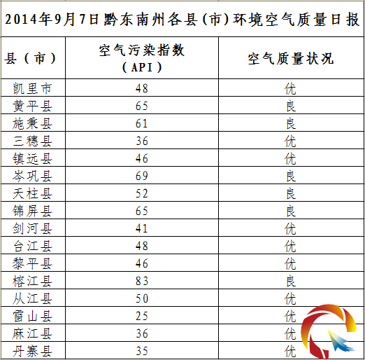 2014年9月7日黔東南州各縣(市)環(huán)境空氣質(zhì)量日?qǐng)?bào)