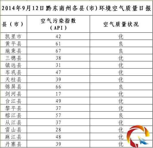 2014年9月12日黔東南州各縣(市)環境空氣質量日報