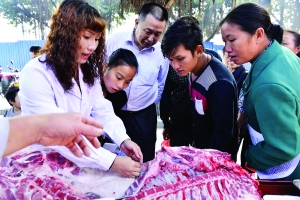22日,榕江縣農業局組織檢疫人員來到街頭,現場教群眾辨別豬肉寄生蟲,并對網傳“豬肉有蟲”進行辟謠。 (王炳真 記者 吳如雄)