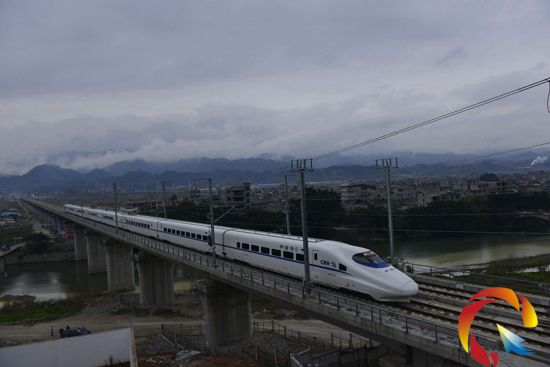 本網訊 12月10日,試運行的和諧號動車在貴廣高鐵貴州榕江段月寨大橋上行駛。