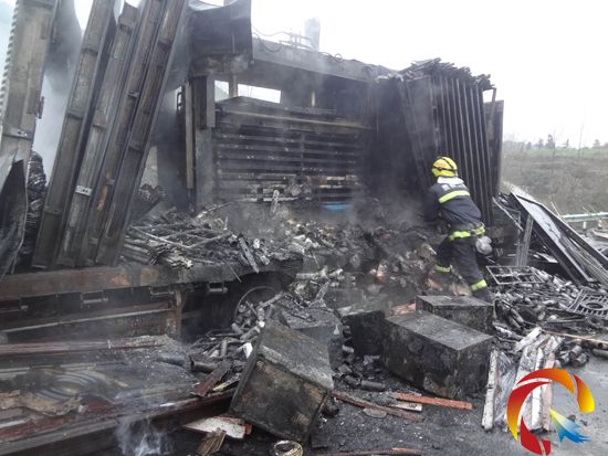 04時35分,消防官兵到達事故現場發現,掛車車尾部分正在猛烈燃燒,車上駕駛員已逃出,無人員被困,但車頭仍無法脫離。了解情況后,指揮員迅速下令出兩支水槍對運貨部分別從車身、車尾兩處進行撲救,并讓一名戰士協同高速交警做好警戒工作,并向支隊指揮中心匯報情況,請求增援。