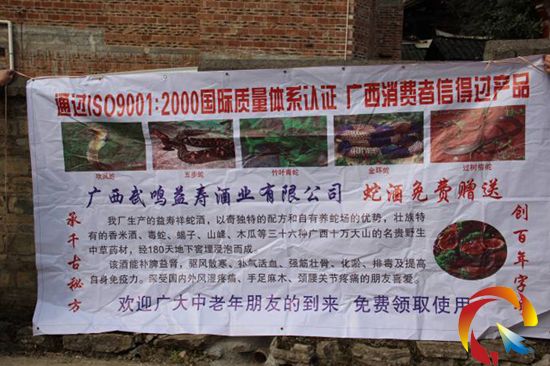 聞訊后,縣工商局聯合縣食品藥監局組織人員趕往現場調查。活動主辦方宣稱:“生產的益壽祥蛇酒,以獨特的配方、自家養蛇場的優勢和壯族特有的香米酒、毒蛇、蝎子、山峰、木瓜等三十六種廣西的名貴野生中草藥材,經180天地下窖埋侵泡而成。該酒具有補脾益腎,祛風散寒、補氣活血、強筋壯骨、化痰、排毒及提高自身免疫力的療效。深受國內外風濕疼痛、手足麻木、頸腰關節疼痛的朋友稱贊。”