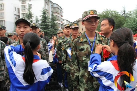 少先隊(duì)員給新兵佩戴大紅花