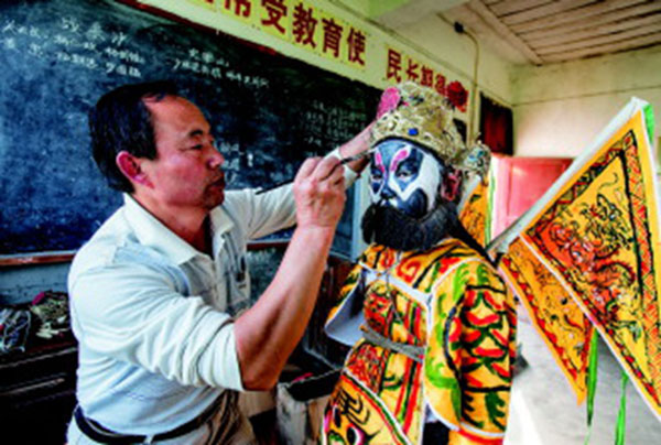 自制戲服、道具為傳承。戲服和道具都是祖上傳下來的,都是大人穿大人使用,小孩子們個子小,戲服穿不了,道具也不能使用。孩子們要唱戲呀!沒有戲服,沒有道具怎么演?在網上訂購服裝,網上的服裝好貴喲!一套就要1000多元。沒錢呀!楊老師根據學生的身材,裁剪服裝,到縣城縫紉,自己在服裝上畫龍繪鳳,硬是用手工制作了15套戲服出來。沒有道具怎么辦,不急,楊老師有的是辦法。山上的竹子,杉木成了他的寶貝。竹子在他手里成了弓箭、寶劍;杉木變成了大刀、長毛、畫戟。把紅、藍、白等色油漆往道具上一抹,錚亮錚亮的道具就一件件地“橫空出世”。30多件自制的刀、槍、劍、棍多合孩子們的手啊!孩子們手握寶劍像劉備,拿起大刀像關羽,手挺長矛似張飛,提起畫戟勝呂布,別提多高興了!