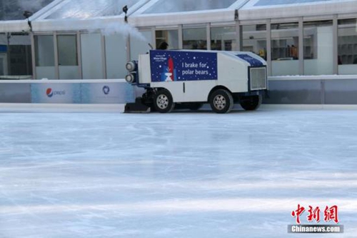 紐約一個戶外溜冰場工作人員在清理冰面。當天紐約氣溫低至零下15度。