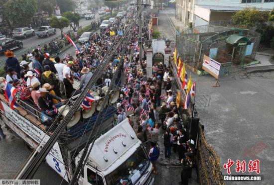 據(jù)外媒報(bào)道,1月26日,泰國(guó)大選提前投票正式開始,約2500名反政府示威者包圍了至少13到14個(gè)投票站,為投票能否最終舉行增加了不確定性。圖為示威者包圍曼谷的投票站。