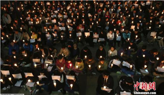 當地時間2014年4月19日,韓國安山,高中生和市民在公園里參加燭光守夜,為“歲月”號
