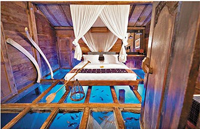 據(jù)悉,這種“鮮蝦套房”是充滿爪哇特色的獨立小木屋,屋內(nèi)鋪上了透明玻璃地板,房客可在房內(nèi)隨時欣賞下面的游魚活蝦,猶如置身海上,可充分感受原野生活。