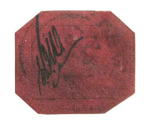 這枚1英寸見方的洋紅色郵票,1856年發行,長3.2厘米,寬2.5厘米,洋紅色的郵票紙上印著一個三桅桿的帆船底,上有黑色字體,為英屬圭亞那的著名口號:“我們奉獻,也期待回報”。這枚郵票同款現存世僅此1枚,此前曾幾次創下單張郵票世界最高價格紀錄。