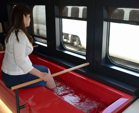乘客可邊泡足湯邊欣賞車窗外風光,每個泡腳池可同時讓4人享受這項服務。另外,還有附吧臺及榻榻米席的指定席車廂,可讓乘客泡完足湯之后,到此放松一下,品嘗特產酒等。