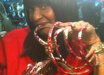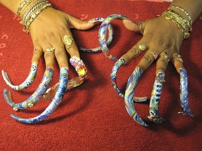 據報道,現年54歲的美國新澤西州女子拉呂•德拉蒙德迄今已有8年沒剪過手指甲,其指甲已長到14英寸(約35厘米)。