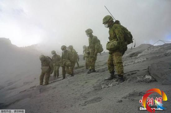 當地時間2014年10月4日,日本長野縣,日本自衛隊士兵在御岳山火山進行救援工作。